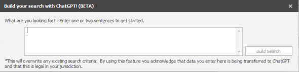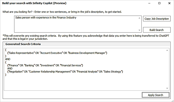 The search criteria generated by ChatGPT is shown in the screen. The user can apply this to their Infinity search or ‘Build Search’ again to see if more suitable criteria is returned.