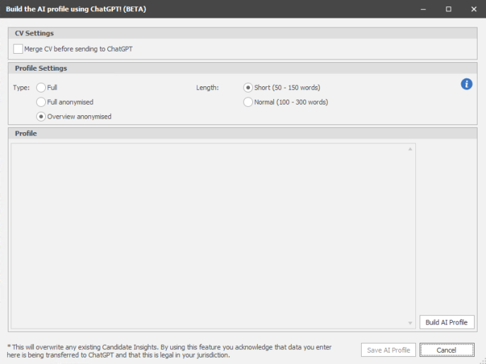 Tick to Merge CV before sending to ChatGPT - Tick only if you have selected a CV that has merge codes within it, this will ensure the merge data is included in the profile builder and not attempt to send merge codes to the AI profile builder.