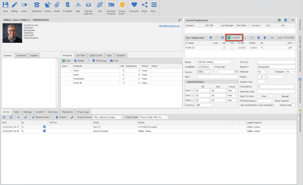 Select the CV file you wish to base the AI profile on, then click on ChatGPT button within the CVs grid