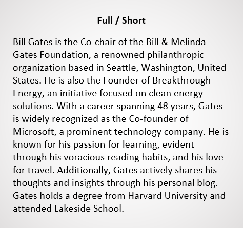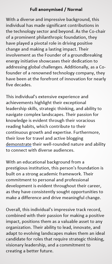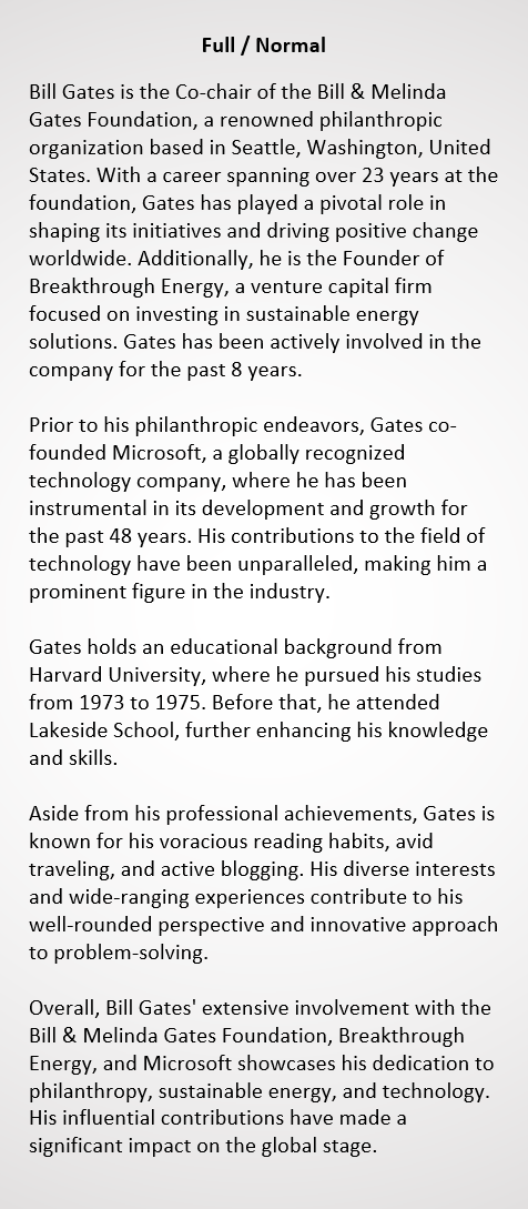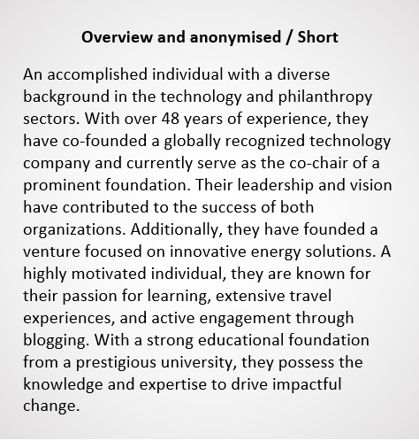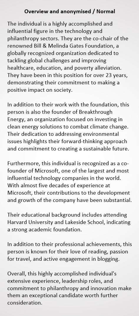Examples of AI produced profiles (using Bill Gates LinkedIn profile)