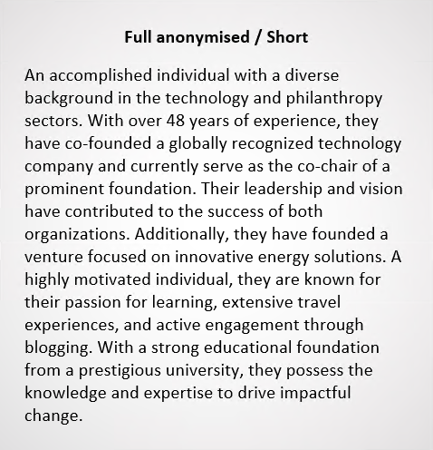 | Full anonymised | Summary of the person that removes all personal information and does not include any company names or brands they have worked for |