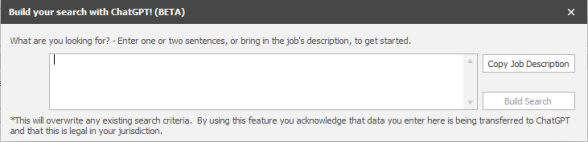 Enter text into the box, regarding the type of candidate your trying to search for, this will then use ChatGPT to setup a criteria that uses AI to build your job title(s), experience and keyword fields. For convenience, searching within a job offers the additional button 'Copy Job Description':