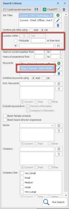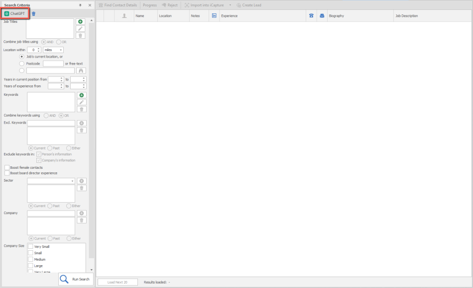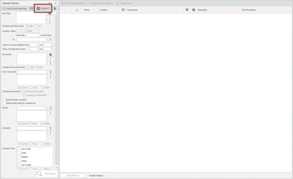 Enter text into the box, regarding the type of candidate your trying to search for, this will then use ChatGPT to setup a criteria that uses AI to build your job title(s), experience and keyword fields. You will still need to define the location.