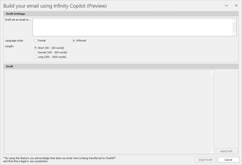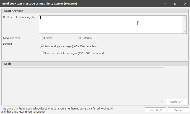 Type in the type of message you wish the AI to write into the open text box, set language style to formal or informal and then the length of characters you wish the message to be. Click Build Draft to preview, you can click again if you wish it to rebuild a different version or Insert Draft to accept it and then you can edit the content before saving and completing your template.