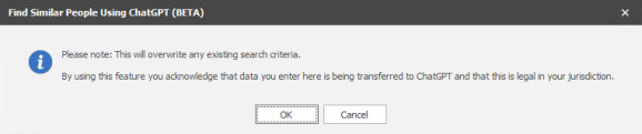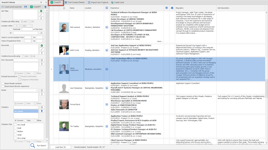 When completing a TalentGraph search you can use a search result as a foundation to search similar people. Click to select the profile you wish to use and then click on ChatGPT and it will use that profile to build a search criteria: