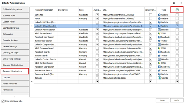 All destinations with the ‘Is Keyword Search’ column ticked have the Copilot column available to configure. The LinkedIn UK X-Ray (Google) and Linkedin X-Ray (Google) default system destinations are ticked as default on new and upgraded databases.