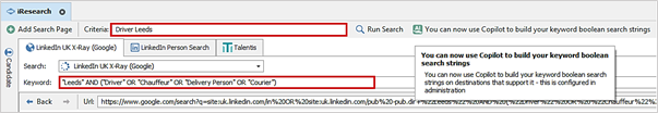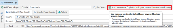 Location information, e.g. ‘Leeds’ will be handled by Copilot where possible and will be put at the start of the boolean search string to improve results.