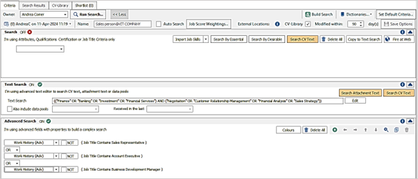 - The ‘Advanced Search’ section is populated with the job titles in “A” OR “B” OR “C” format using the ‘work history’ field and ‘contains’ operator