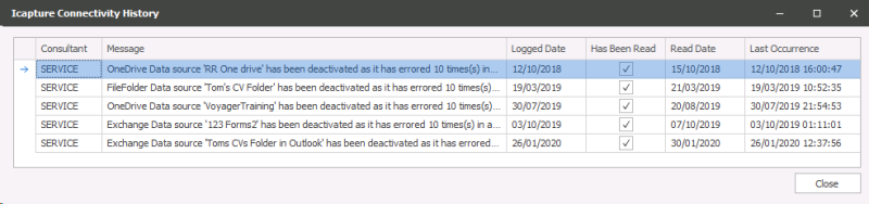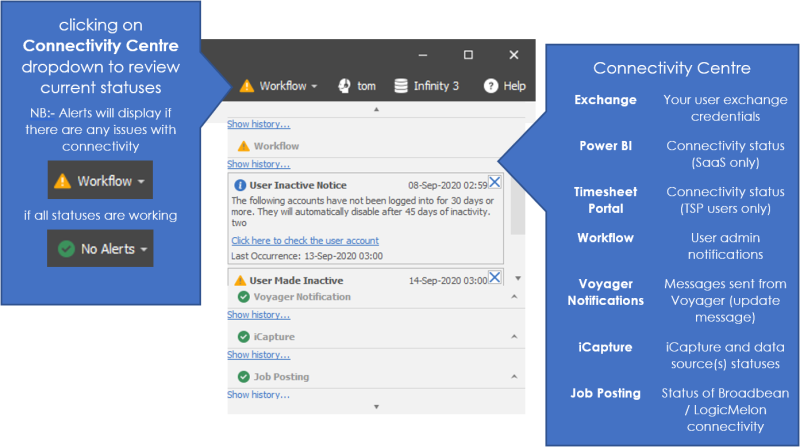 The connectivity centre shows alerts e.g. Authentication issue with Exchange, integration problems etc. Some warnings will only display for DBManager's but any warning should be reviewed quickly in order to ensure fully function. These warnings may also be sent to you via email, Voyager notifications are not included as these are usually messages related to release details. To enable email notifications see user options