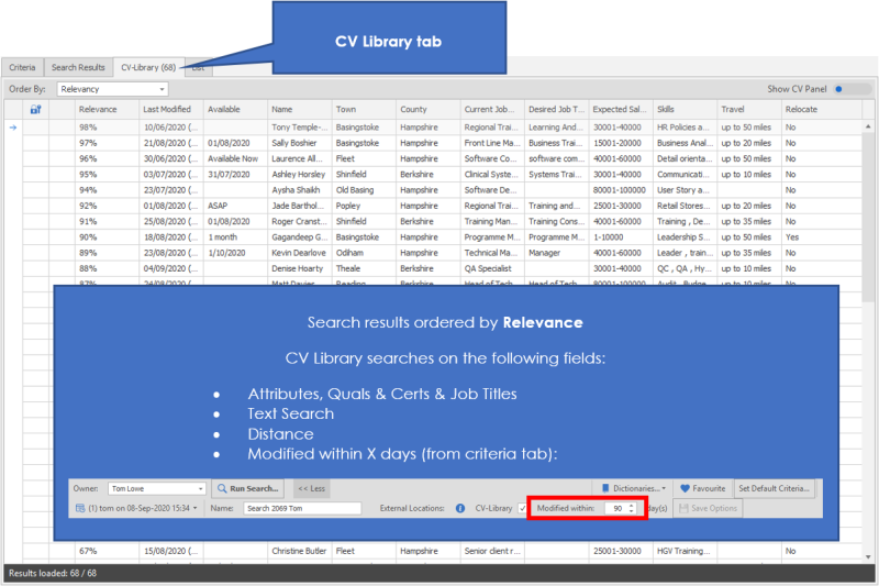 Once activated the CV Library tab will be included in all candidate searches (ad hoc or job searching):