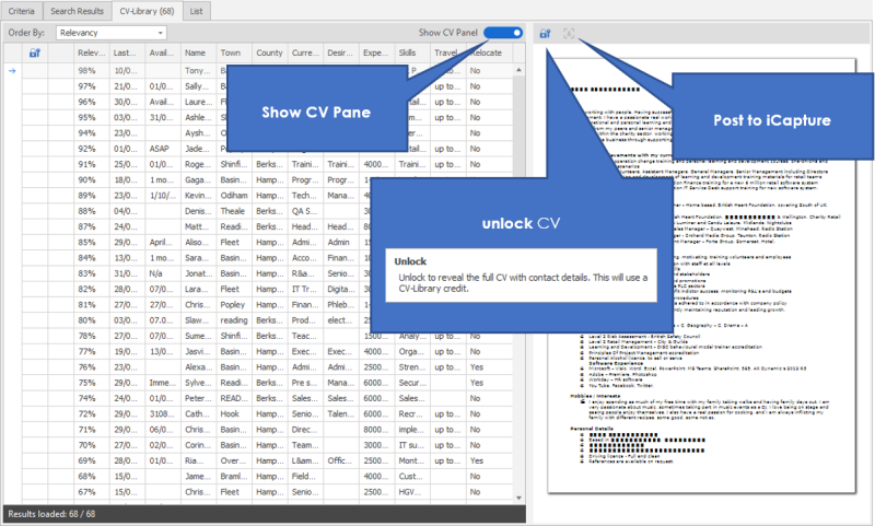 You can review candidates CV, these will initially display redacted information. If you wish to view full CV you will need to unlock the record, this will use a credit (you will need to register with CV Library). Once unlocked, you then have the additional option to "Import to iCapture" (Post to iCapture):