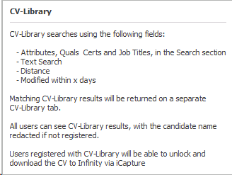 NOTE: - all users will be able to review redacted CV's, CV Library account will be required to view full CV's and import them into iCapture, you will need to notify CV Library to enable the CV Library Search API, contact your Client Response Co-ordinator or email support@cv-library.co.uk