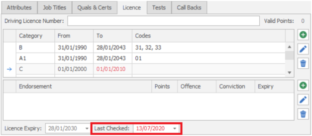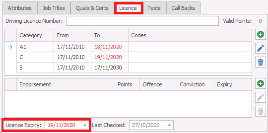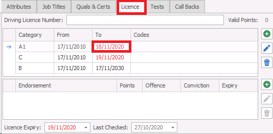 The driving licence category ‘to date’ is stored on the candidate page driving licence tab. The date appears in red, if it has expired, or will expire in the next four weeks