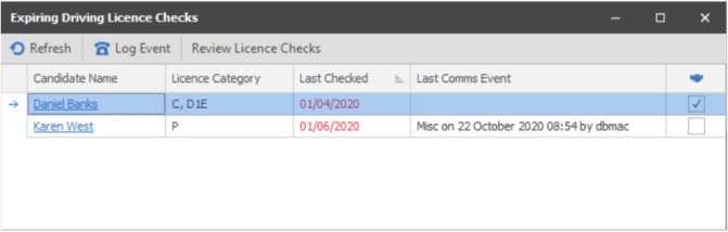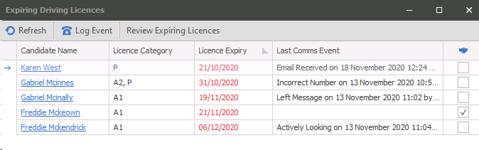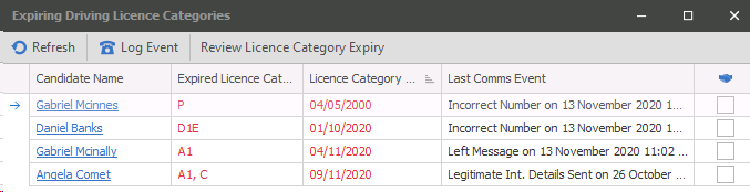 The toolbar has functionality to refresh the list, log a candidate event for the selected record and review the expired licence categories by opening the candidate page in review mode