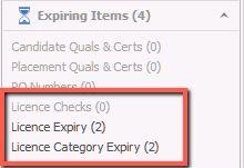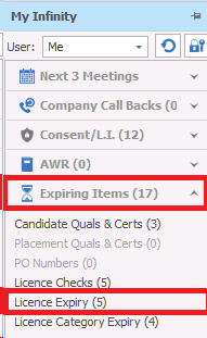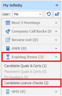 There is a new sub section in My Infinity ‘Expiring Items’ called ‘Candidate Licence Checks' that is only visible if ‘Enable driving licence functionality’ is ticked in the admin screen