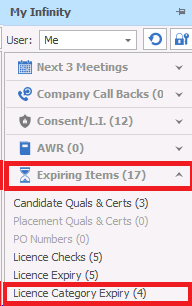 There is a new sub section in My Infinity ‘Expiring Items’ called ‘Licence Category Expiry'