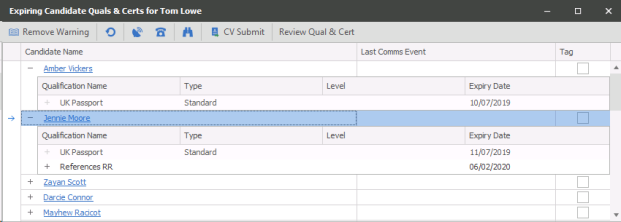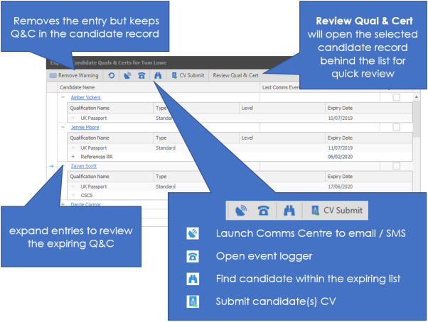 Candidate Quals & certs – The review dates are set per Qualification or certificate and will display expiring or expired quals and certs for all candidates you have added Q&C's against. See Quals and Certs dictionary for more details.