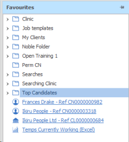 The favourite’s panel enables you to store a list of favourite records so they are easily accessible. All record types can be made a favourite (candidate, company, location, contact, job, interview, placement, search, reports).