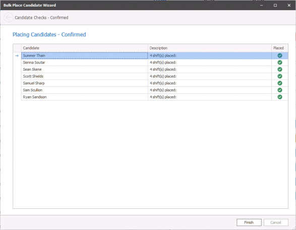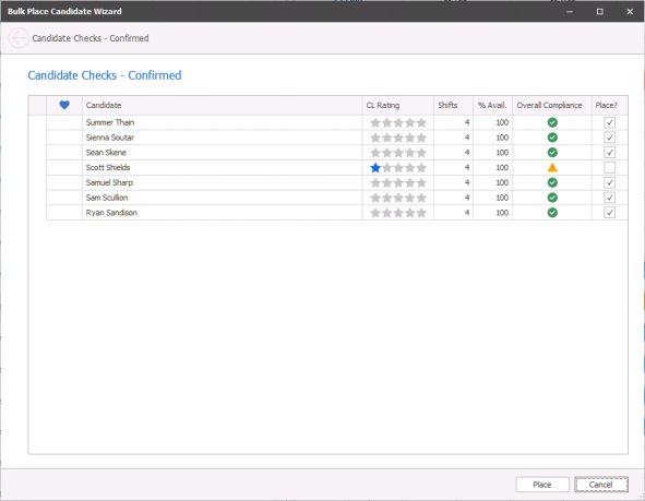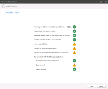 Candidates that have passed all checks will be ticked, candidates with warnings will require a user to confirm (tick the Place checkbox) and if there is any preventions then you will not be able to tick