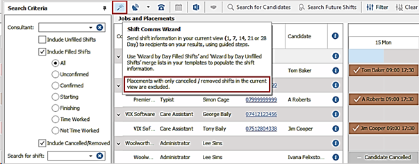 The Shift Planner Comms Wizard excludes placements with only cancelled/removed shifts in the current view because its primary function is to send details on filled placement shifts and/or unfilled jobs shifts only.