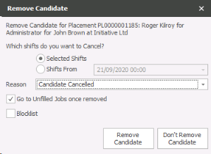 Removes the candidate from the shift (the shift will remain against the job and will display as unfilled