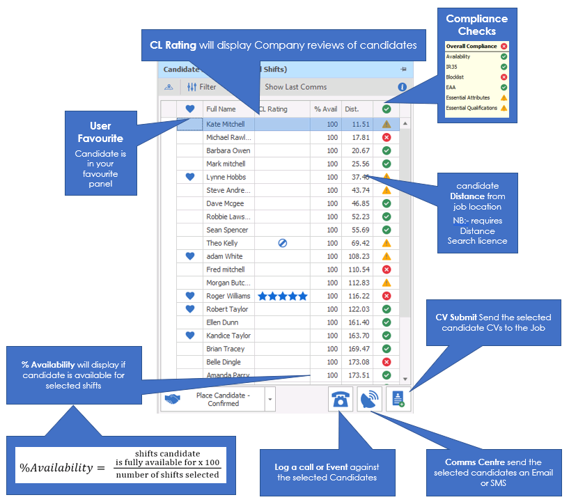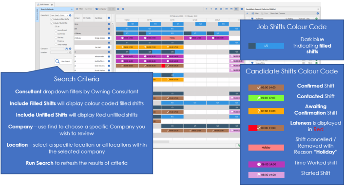 Clicking on a shift will automatically activate the system to find appropriate candidates, these will be displayed within the Candidates panel on the right