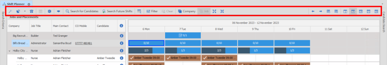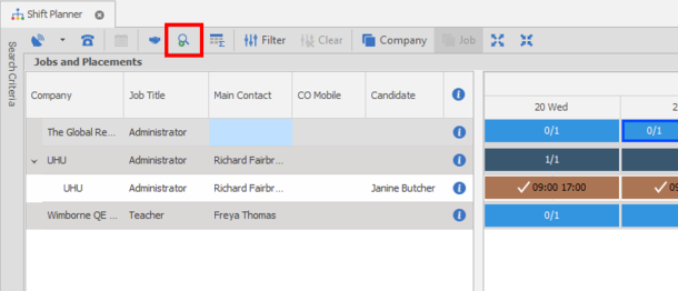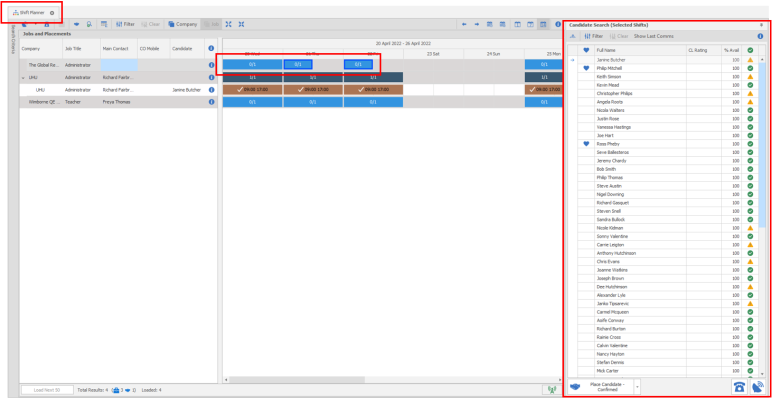 When Viewing unfilled shifts in the shift planner, selecting shifts in the job header row will search and return available candidates in the search result panel, this panel can be set to automatically open or only when clicking on search for candidates (see user options for more detail)