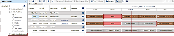 When ticked, placements are returned that have cancelled/removed shifts in the current view (1,7,14,21,28 days). This enables placements where shifts have been cancelled for the whole date period to be returned.