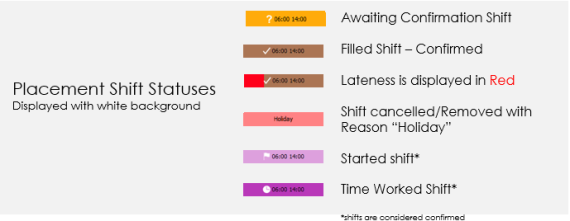 | Grey coloured shifts prefixed with '-' means the candidate was removed from the shift for a reason other than 'Holiday / Illness / No Show'. The reason is shown as the text label |