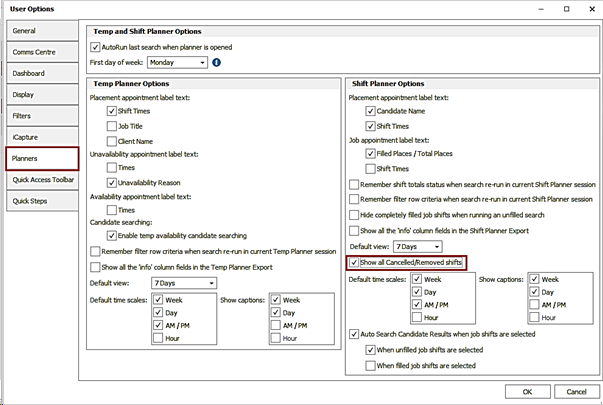 Cancelled / removed shifts logged as ‘No show / Holiday / Illness’ are always shown in the Shift Planner calendar, but all other cancelled / removed shifts are shown only if the settings to show them is ticked in User Option / Planners tab.