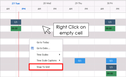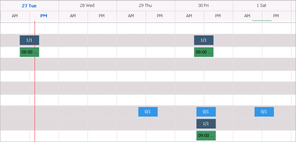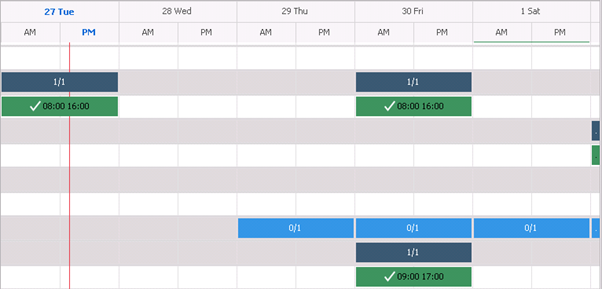 Columns displayed in the calendar are set using the ‘Time Scales’ option in the right click menu. This currently defaults to show days as two columns AM/PM. Shifts with start and end times that fall within an AM or PM column plot to that width rather than a full day.