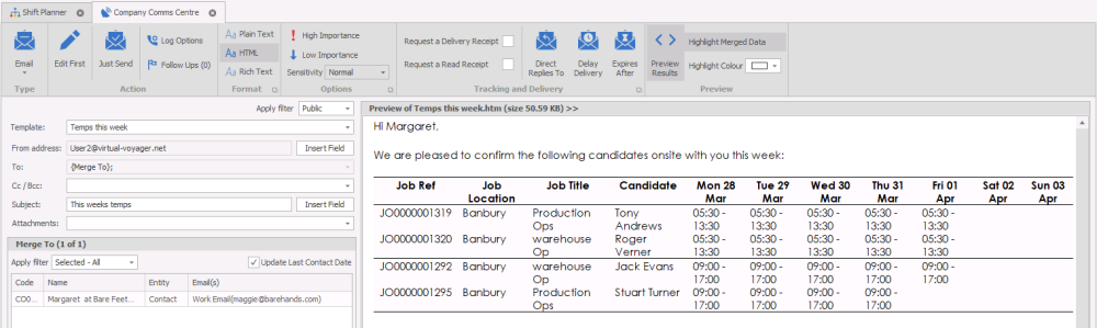 The Shift Planner Comms Wizard allows you to send Emails or SMS messages to Candidates & Contacts without leaving the Shift Planner. For example -