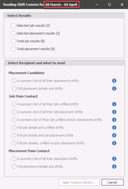 When the comms wizard is loaded, the window title bar displays the date range from your Shift Planner current view