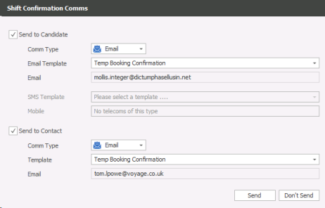 NB:- When placing candidates into confirmed shifts you may have a system prompt to send out confirmation email / SMS to candidate and contact, see the Global Temp Defaults General settings. This may also be sent automatically to candidate and / or contact.