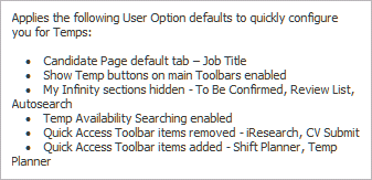 This function is for Temp users and will allow you to complete numerous setup options in one click, below details the user options it configures: