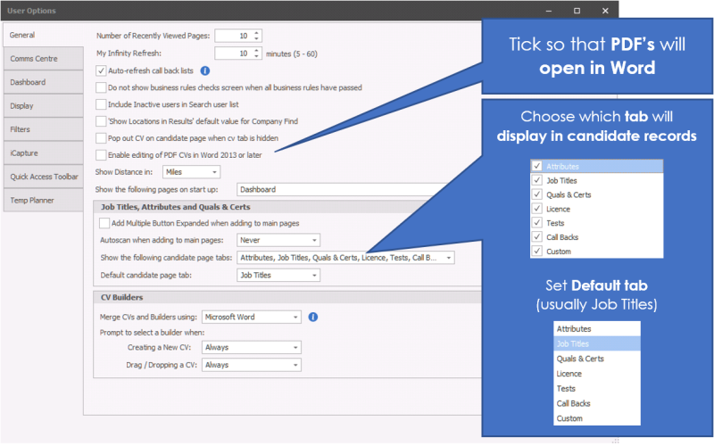 Ensure you enable editing of PDF CV's, so Infinity opens PDF CV's in Word and ensure that you set Default candidate page tab to Job Title