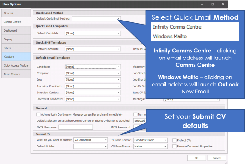 Set desired defaults for Submit CV, setting CV Name format to Candidate Name will set CV's attachment name (i.e. CV of John Smith), setting CV Save Format to DOCX will set CV's attached to submissions as DOCX, Protect CV's will set the DOCX to Restricted and ensure it is uneditable.