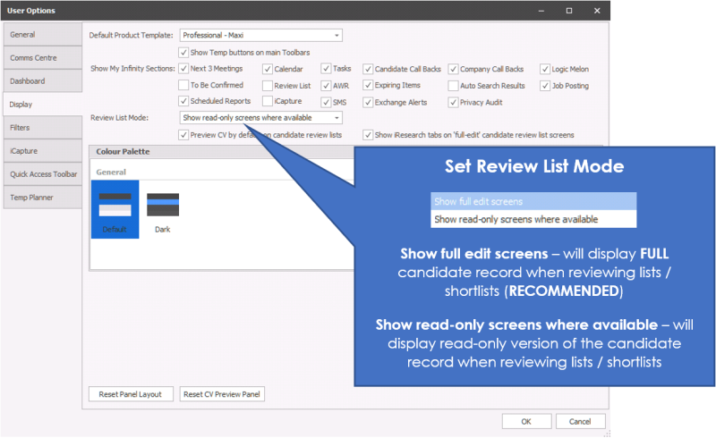 The key setting is setting how you want the Review List Mode, it is generally recommended that you set it to "Show full edit screens", this will ensure full candidate records will be displayed when in review mode. Read-only mode will offer a reduced version of the candidate record, including the CV