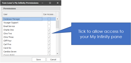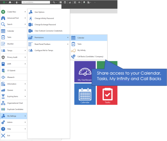 1. Share access to your My Infinity, calendar, call backs with colleagues via Application Menu, My Settings, Permissions: