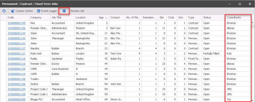 Functionality is the same as 'My Jobs – Perm/Contract’ My Infinity section but the grid has an additional column for consultants