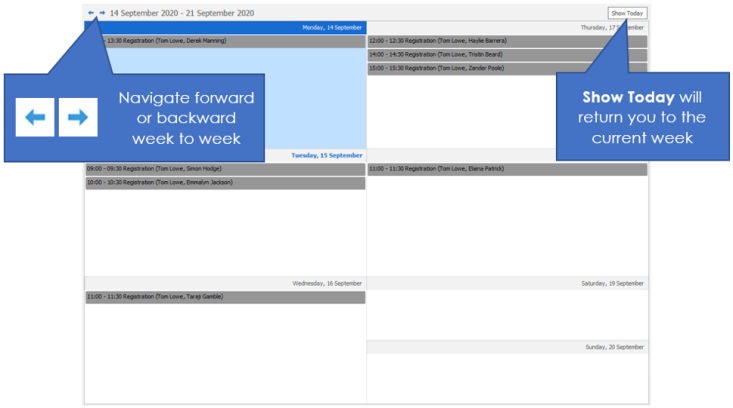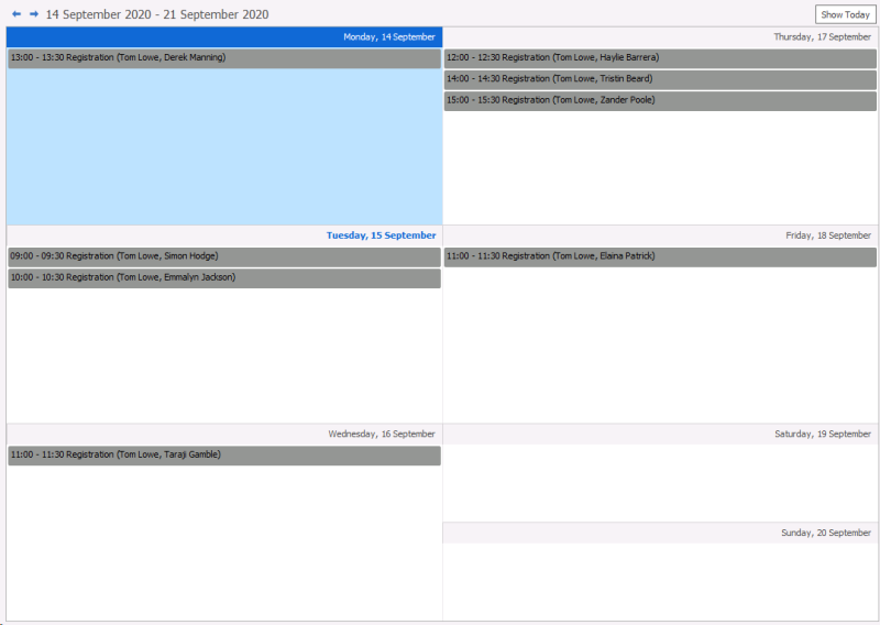 This shows a defaulting weekly view of the internal interviews (registrations) that are due to happen. Double click on any entry to go to the interview record. You can leave the internal interview board open as a tab to review to throughout the day,