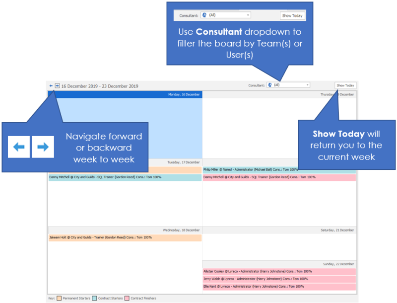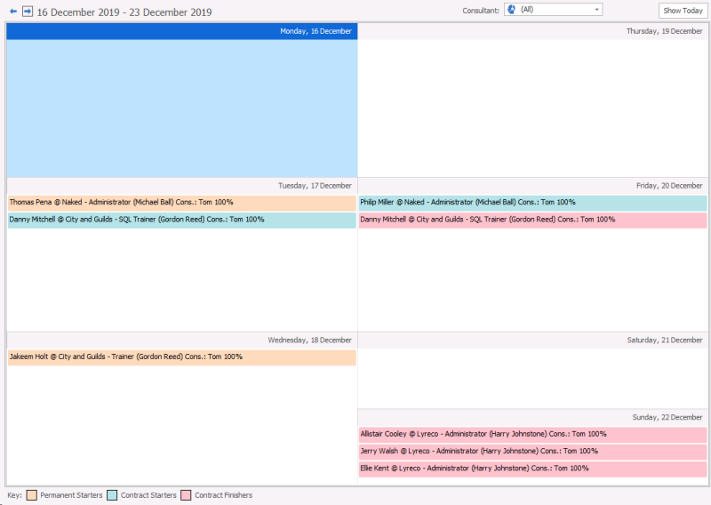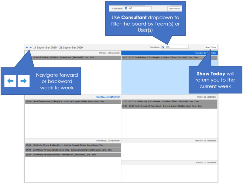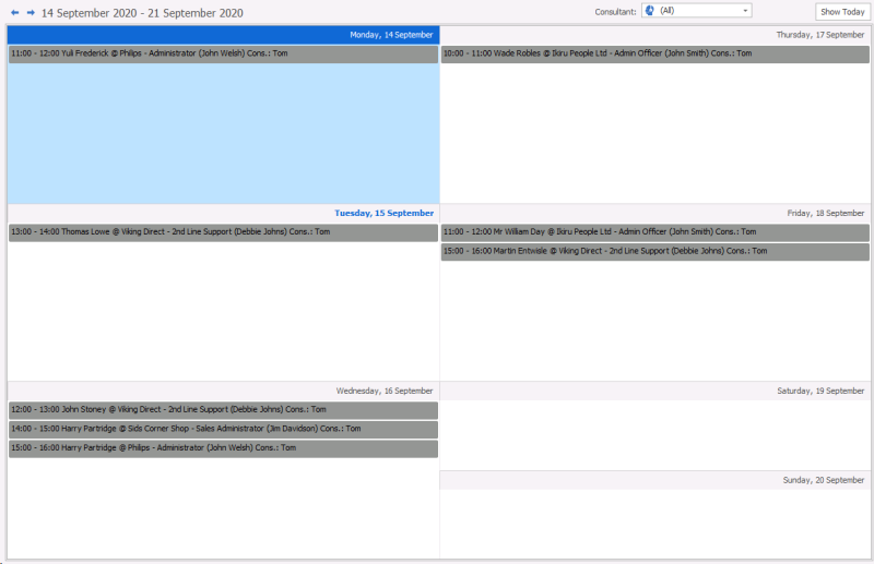 This shows a defaulting weekly view of the external (client) interviews that are due to happen. Double click on any entry to go to the interview record. You can leave the interview board open as a tab to review to throughout the day