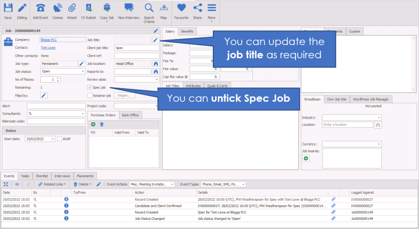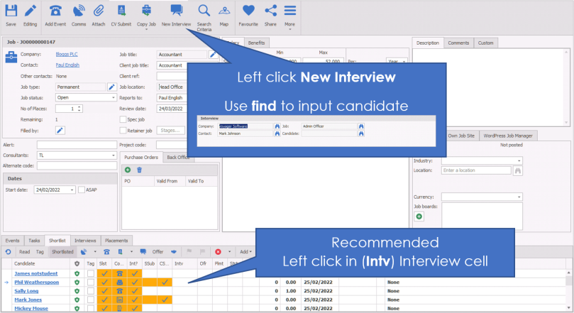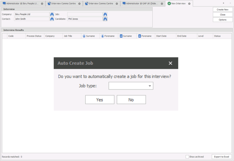 - You can also automatically create Jobs via the “New Interview” and “New Placement” screen