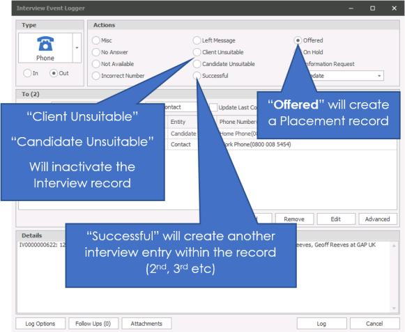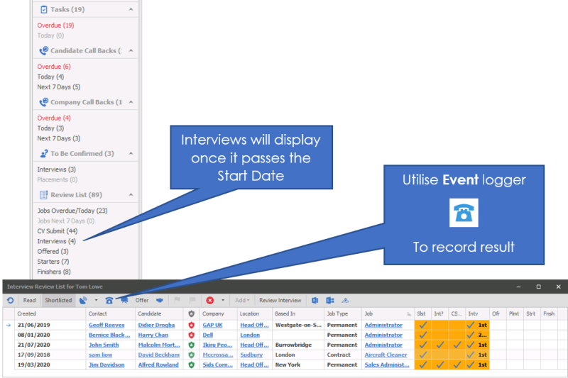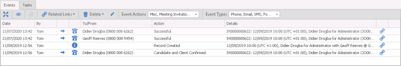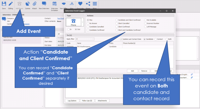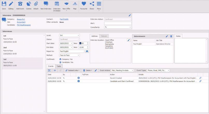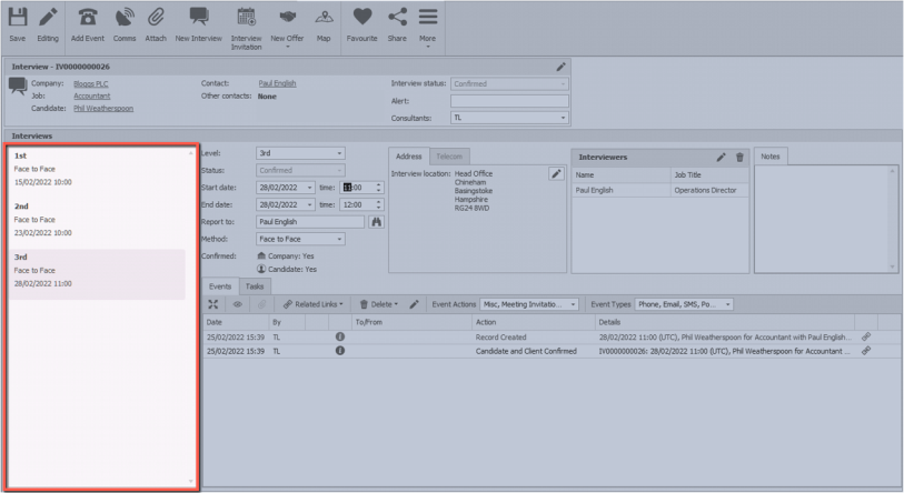 The events log at the bottom of the screen shows all the communication against the interview.
