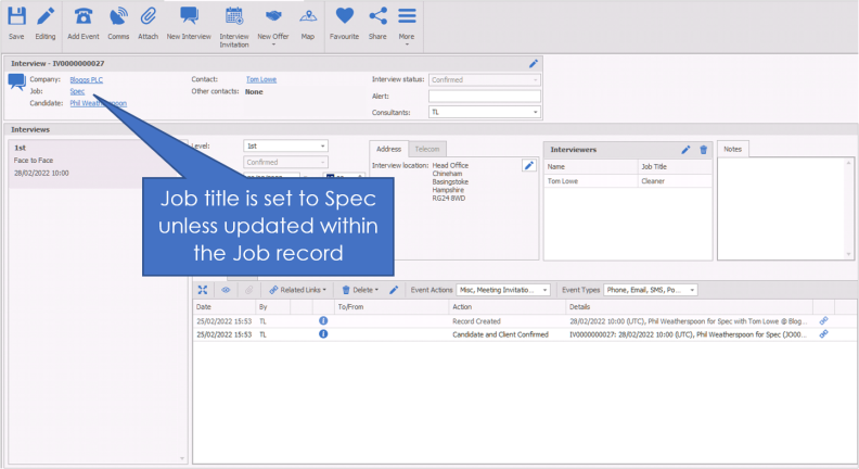 - You’ll be taken to the newly created Interview page. Note that the Job field says “Spec”