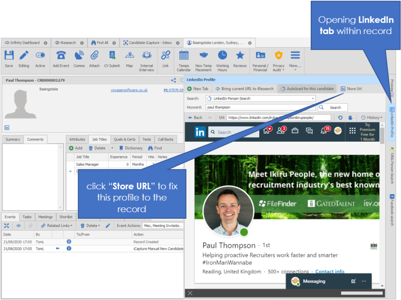 You can quickly link the candidate record to their LinkedIn profile within their record. If the candidate had included their LinkedIn URL within their CV or created via iResearch it may already taken the LinkedIn URL into the candidate record.