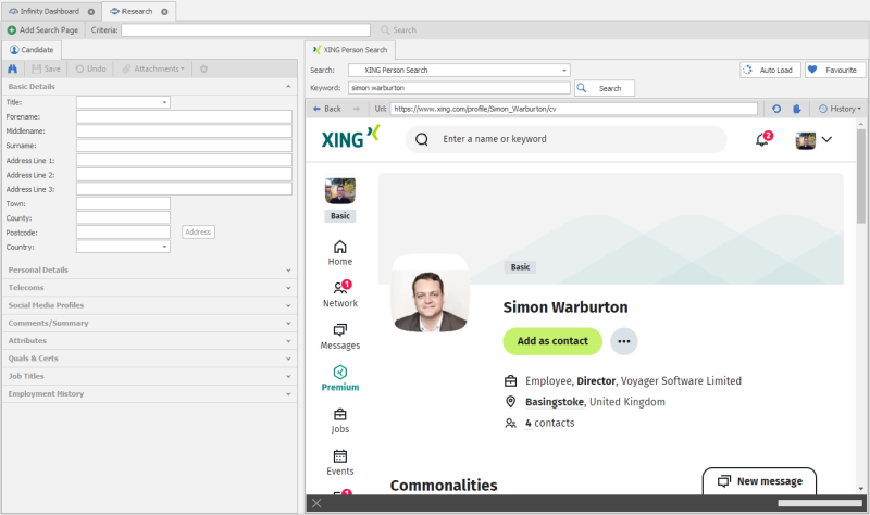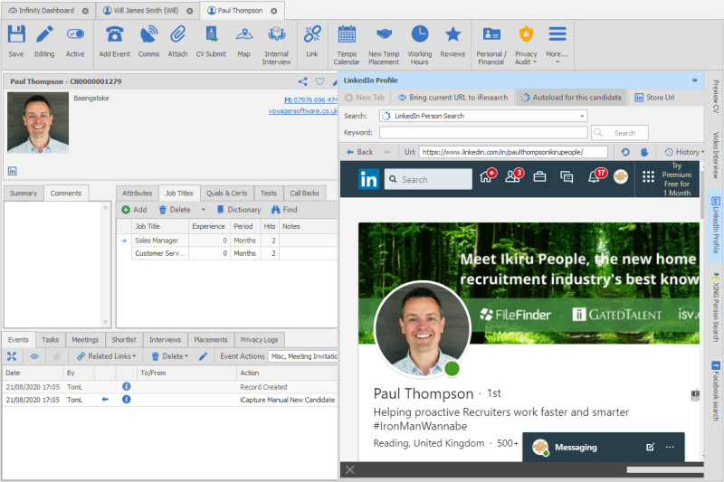 The candidate will now have the iResearch icon against their record and when you click on the LinkedIn / Xing / Twitter tab the candidate’s LinkedIn / Xing / Twitter profile will pop out. Depending on which option you have selected to search against. The number of iResearch tabs that are displayed within the candidate record is via the iResearch administration area although it can be manually adjusted via the Autoload button within the iResearch tab.
