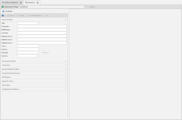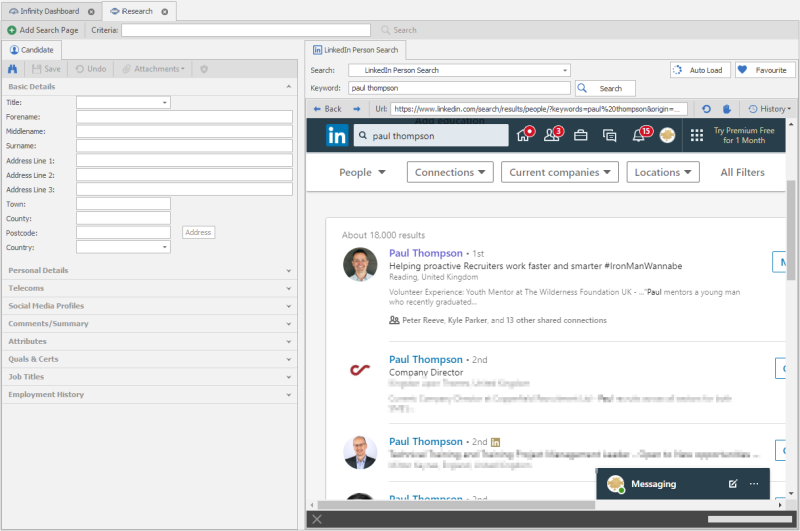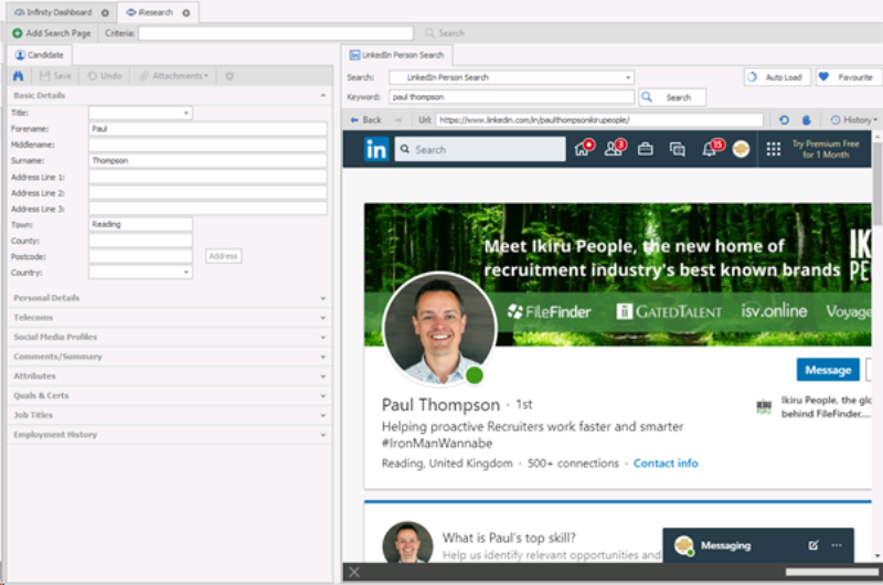 iResearch is a facility that allows you to access social media profiles and extract this information to a candidate record. In particular, using LinkedIn to export a profile and add this to an existing candidate record or even create one. It can be used to research an existing candidate or to complete a search of social sites or other sites external to Infinity**.