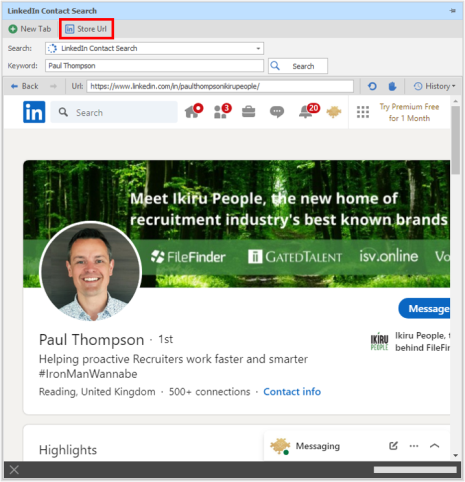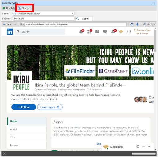 Select the appropriate entry or using LinkedIn's searching facilities find the appropriate Company record and then use the Store URL button: