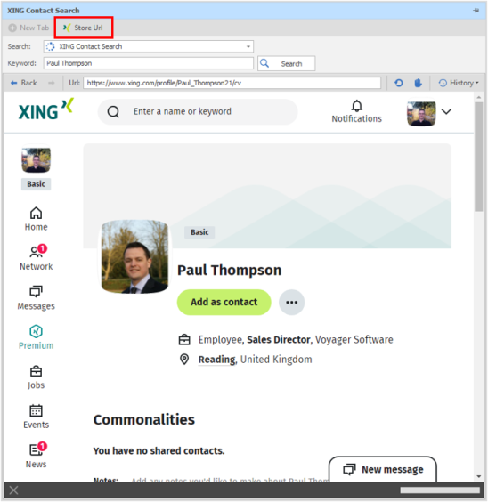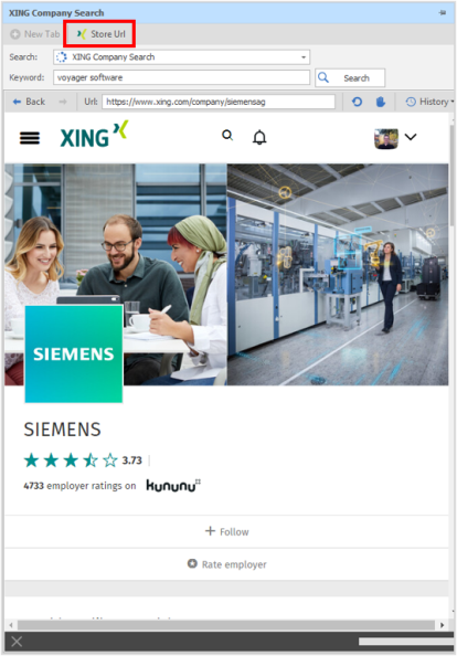 Select the appropriate entry or using Xing's searching facilities find the appropriate Company record and then use the Store URL button: